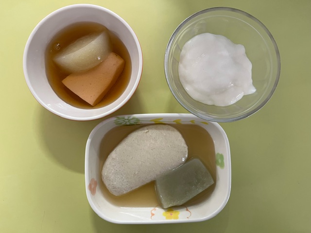 | 形態 | 全粥をミキサーにかけゲル化剤を加えゼリー状にしたもの |