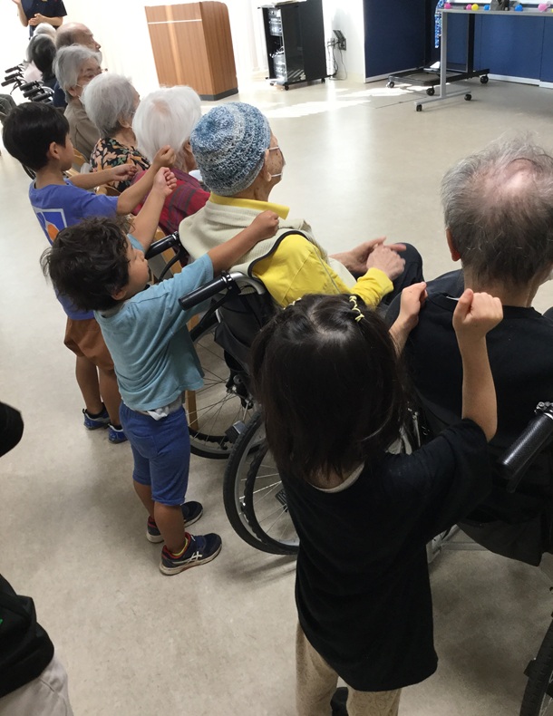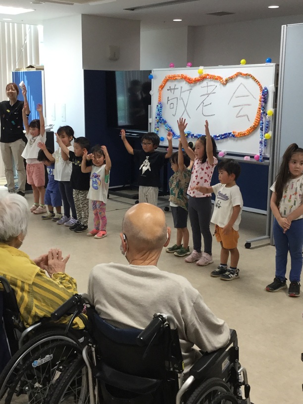 園児にとっても初めて敬老会への参加です。曾おじいちゃん、おばあちゃん位の利用者さんを前に、最初は皆さん緊張しながら習った歌や振り付けを披露してくれました。