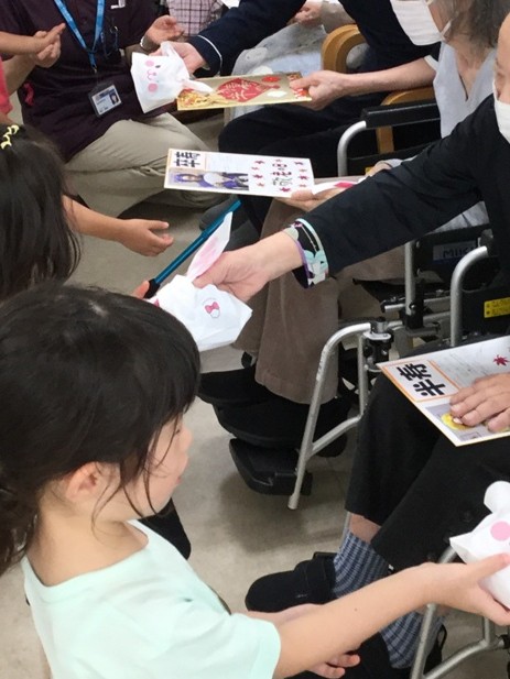 終わるとやっと園児達に笑顔が自然に浮かび、一所懸命な園児たちに利用者さんも身を乗り出し笑顔で拍手していました。歌の後は1人1人の利用者さんの肩をタントンタントンと叩いて最後にお祝いの色紙を渡してもらいました。可愛いく一生懸命な園児達より元気をいただいた1日でした。