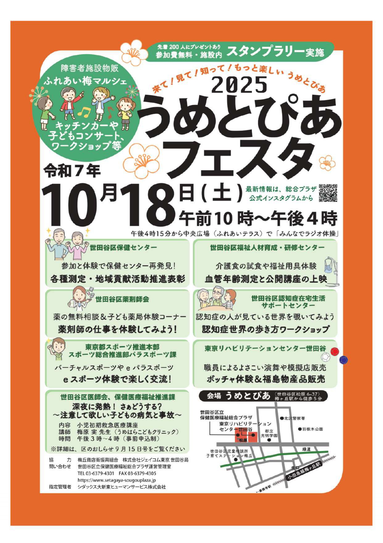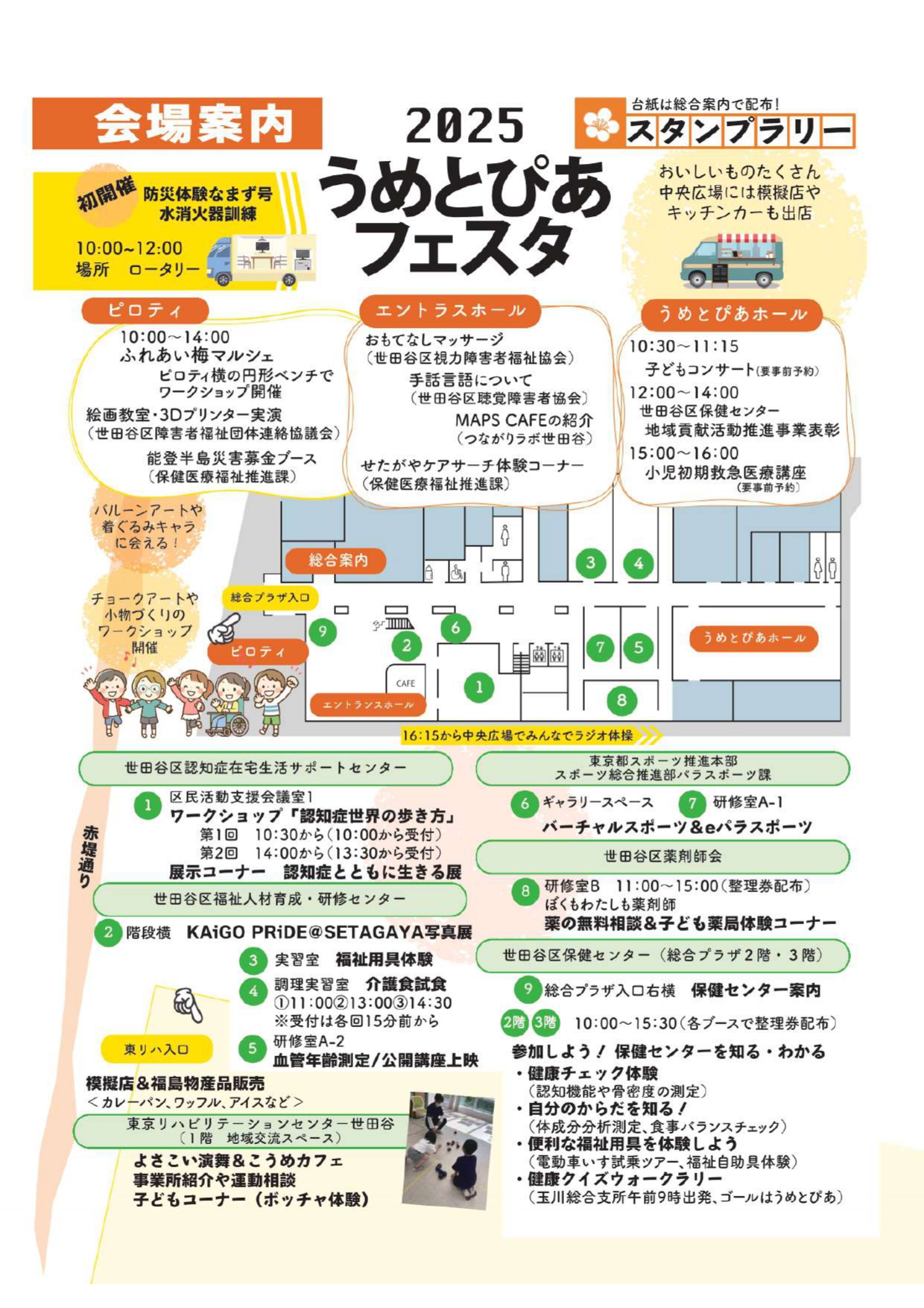 隣接する世田谷区立保健医療福祉総合プラザでは、起震車体験や水消火器訓練、バルーンアートやチョークアートワークショップ、キッチンカーや模擬店など、ご家族で一日中お楽しみいただけます。