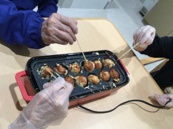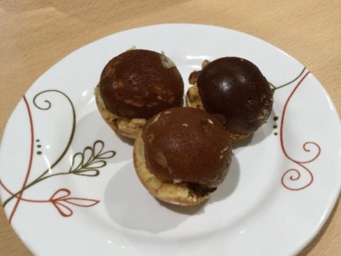 今回はベビーカステラ作りに挑戦しました。材料を量って混ぜ、生地を作りました。あとは、たこ焼き器に生地を流してくるくると回して焼き色がついたら出来上がりです。