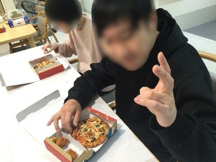 利用者さんと職員で一緒にケーキを作り、テイクアウトしたピザと一緒に食べました。ケーキ作りでは、ケーキのスポンジにクリームを塗ったり、フルーツをデコレーションしたり、カラフルで美味しいケーキができました!