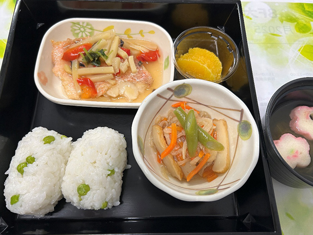 当院では患者様に合わせて美味しく安全に食事を楽しんでいただけるように様々な工夫を行っています。季節を感じていただくために行事食を取り入れ、患者様に合わせた食形態、食器や補助具を提供しています。