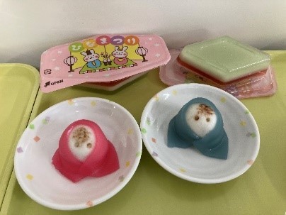 今年のひなまつりのおやつでは、菱餅のような3色の層になっている「ひなまつりケーキ」や、お雛様お内裏様の形をした「ひなまつりまんじゅう」などが提供されました。