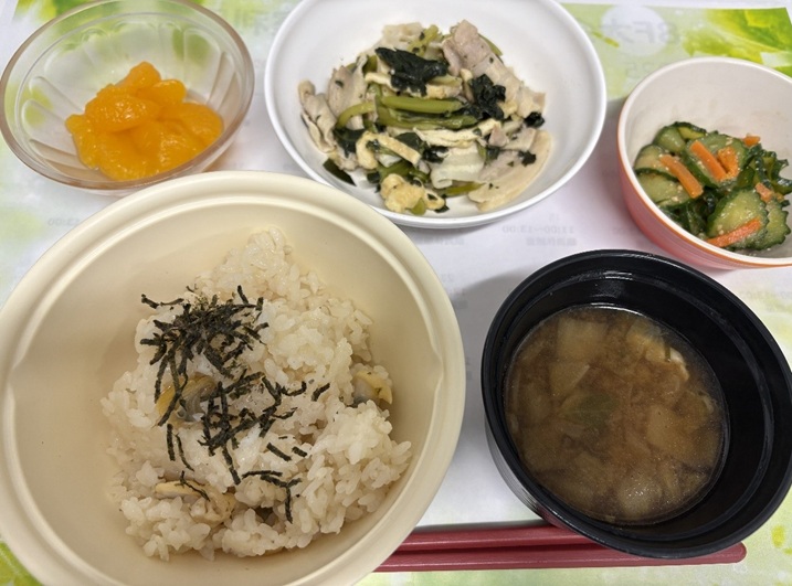 初回は4月21日昼食に東京の郷土料理として深川めし、小松菜と豚肉の野菜炒め、胡麻よごし、味噌ちゃんこスープをお出ししました。